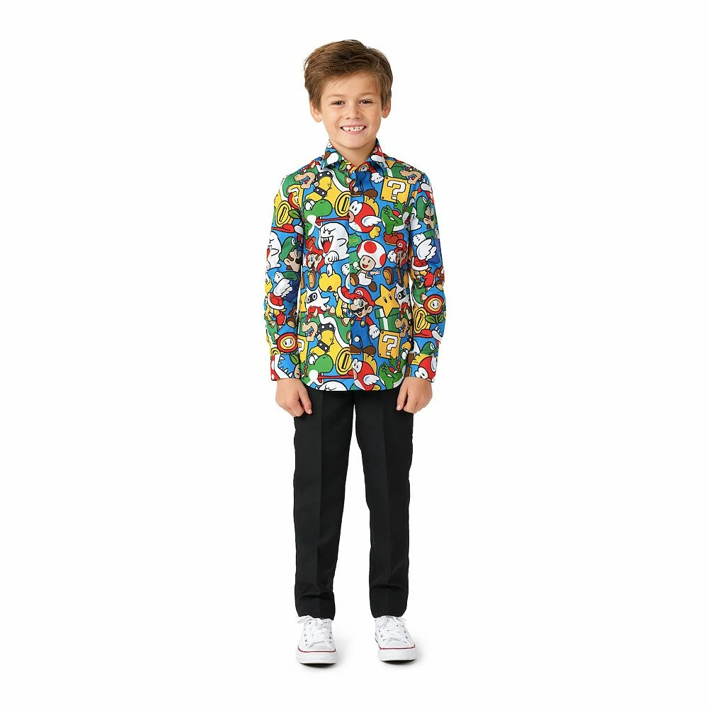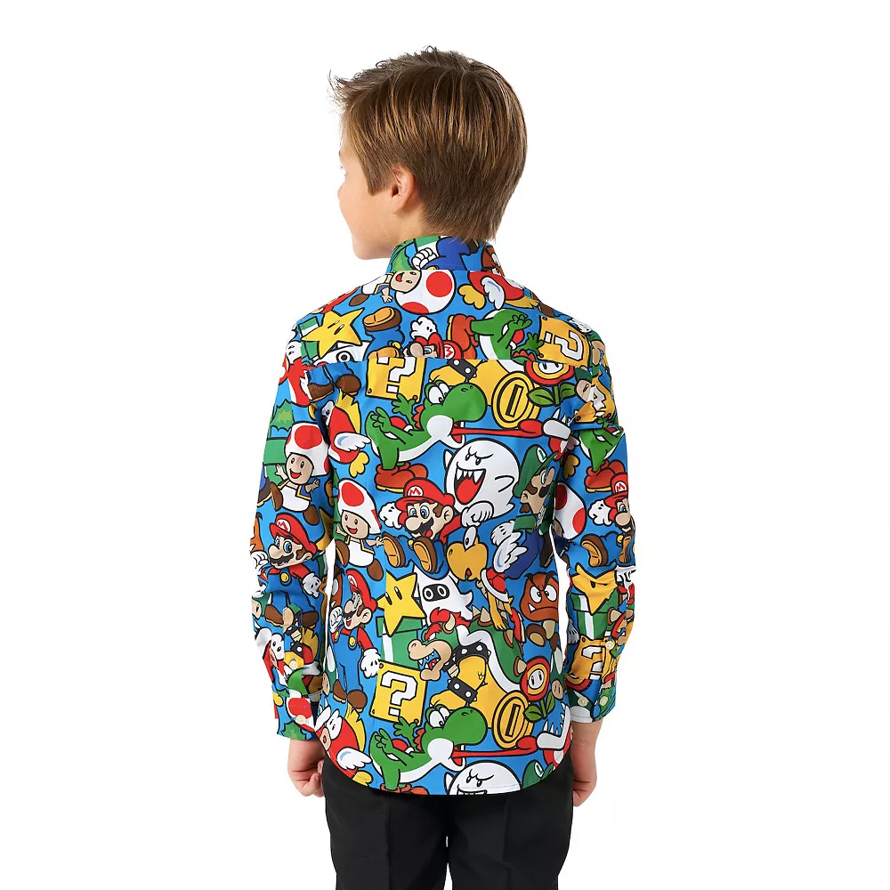 We’ve got the answer to your sentimentality and his gaming right here. Power-up his look with this colorful Super Mario shirt. Covered in an all-over print with all the iconic characters from the Mushroom Kingdom, he’ll win the outfit game for sure. This shirt has a long fit, which makes it easy to tuck in his pants and even while he’s running around it will stay in there, because it’s specially designed to wear in combination with a suit.