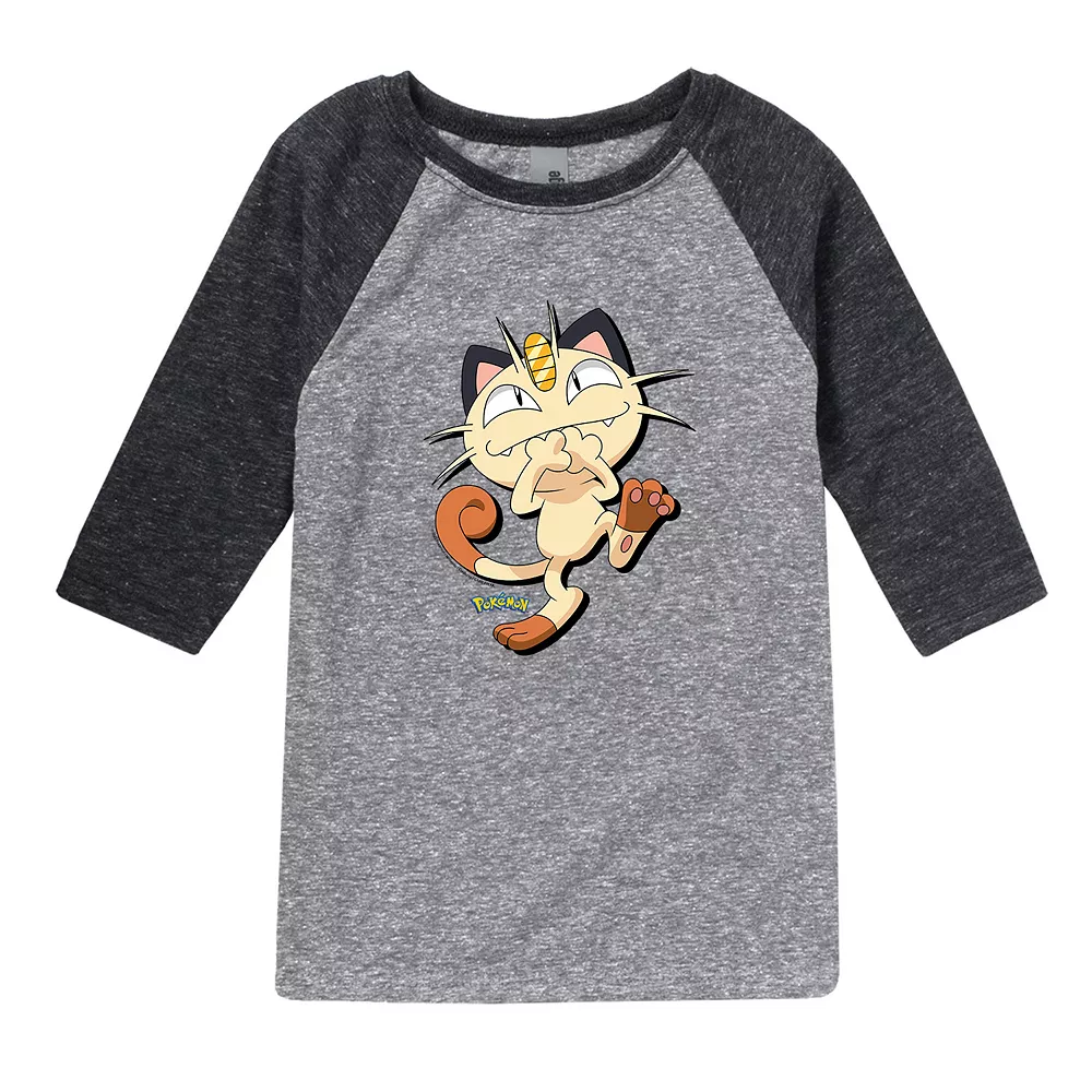He’ll love wearing this boys’ Pokemon Meowth Shadow Graphic Raglan Tee.