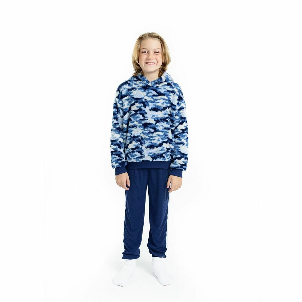 Give your little adventurer all the cozy snoozes they’ll need with this two-piece camouflage pajama set. Made from a unique and furry fleece fabric, this hooded camo sleep top features a handy kangaroo pocket for hiding snacks, and the contrasting jogger-style pants are super comfy and warm. The perfect set for bedtime or just lounging around the house.
