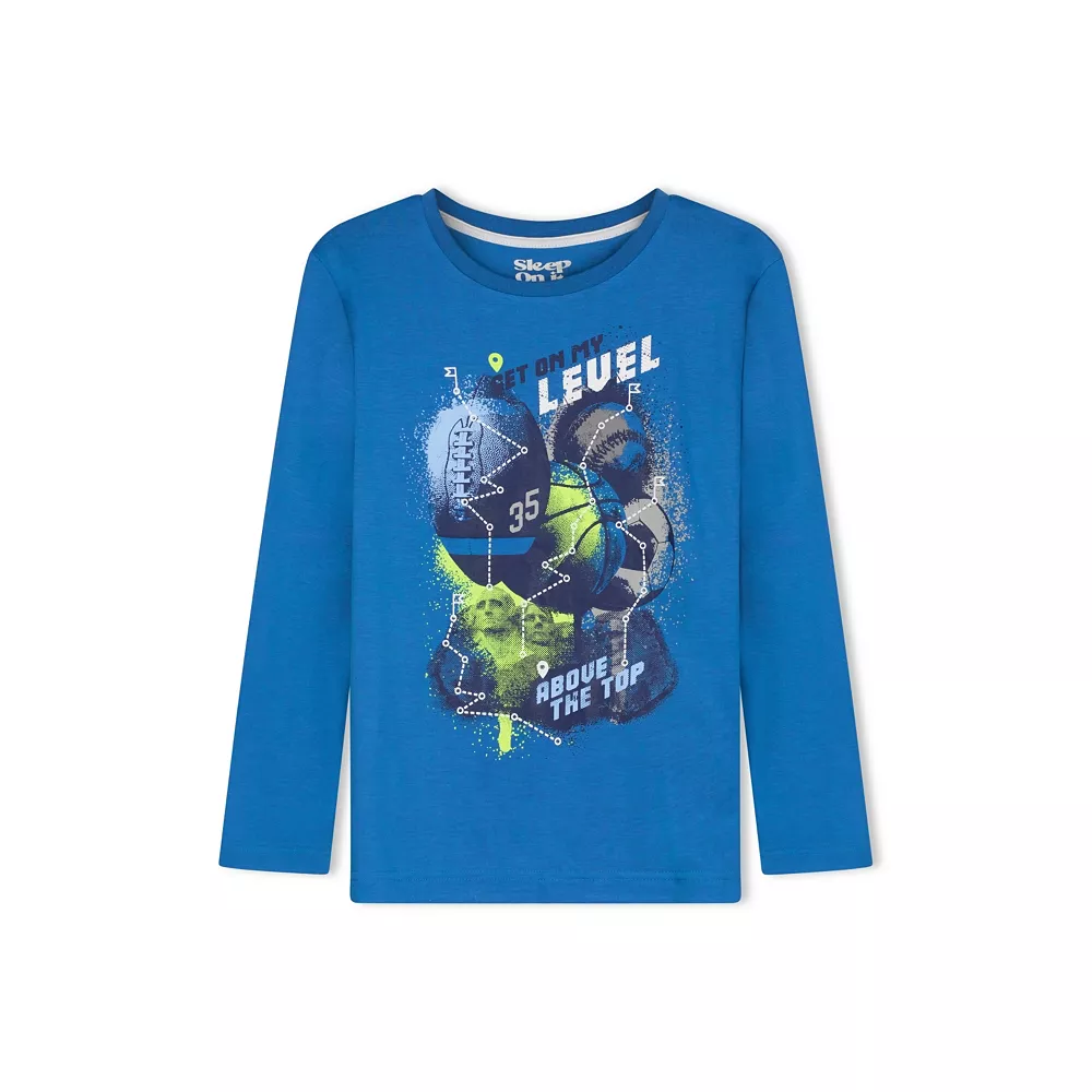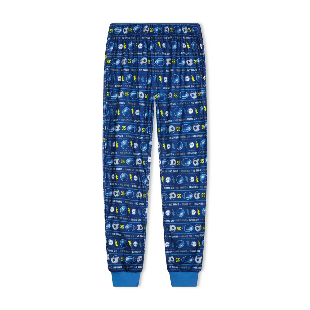 Get on his level with this cozy two-piece pajama set. Made from a super-soft brushed jersey fabric, perfect for keeping him warm all winter long. The long-sleeved top features a crew neck for comfort and a bold metallic sports-themed graphic. Coupled with the loose fitting and uber comfortable pajama pants, with their matching all-over sports print, he’ll feel next level every night.