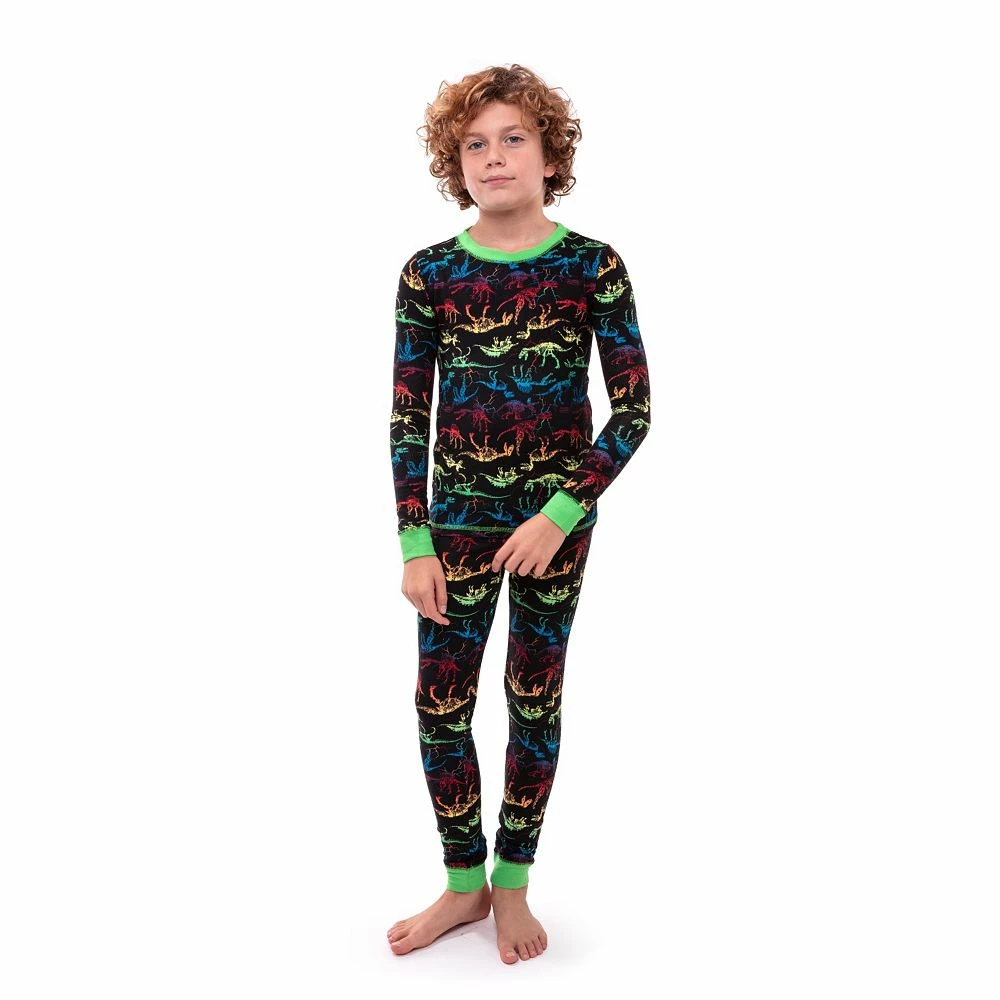 Dinosaurs are the stars of the show in this totally awesome technicolor pajama pairing. It includes a long-sleeve crew neck top and elastic waist bottoms in our stretchy yet close fitting snuggle jersey material.