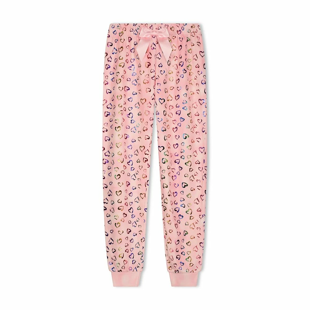 For the coziest night’s sleep, she’ll need this two-piece pajama set made from our super-soft velour fabric. Both the high-low hem, long-sleeved top, and the loose-fitting pants have a soft pink material with a bold rainbow print and matching all-over rainbow hearts on the pant legs. For extra comfort, she’ll love the stretchy waist band and cuffed ankles. The pants also feature a stylish mock tie waist detail.
