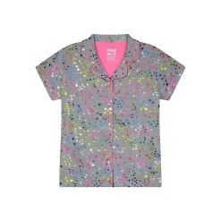 Reach for the stars in this classic style button-down pajama set with a modern design twist. Made with a super-soft jersey fabric, this shorts set has a fun all-over rainbow butter foil print. Featuring a smart collared style with contrast piping, a sweet ribbon bow detail, glittery buttons and a matching hair scrunchie. This is the perfect set to keep her cool and stylish all summer.