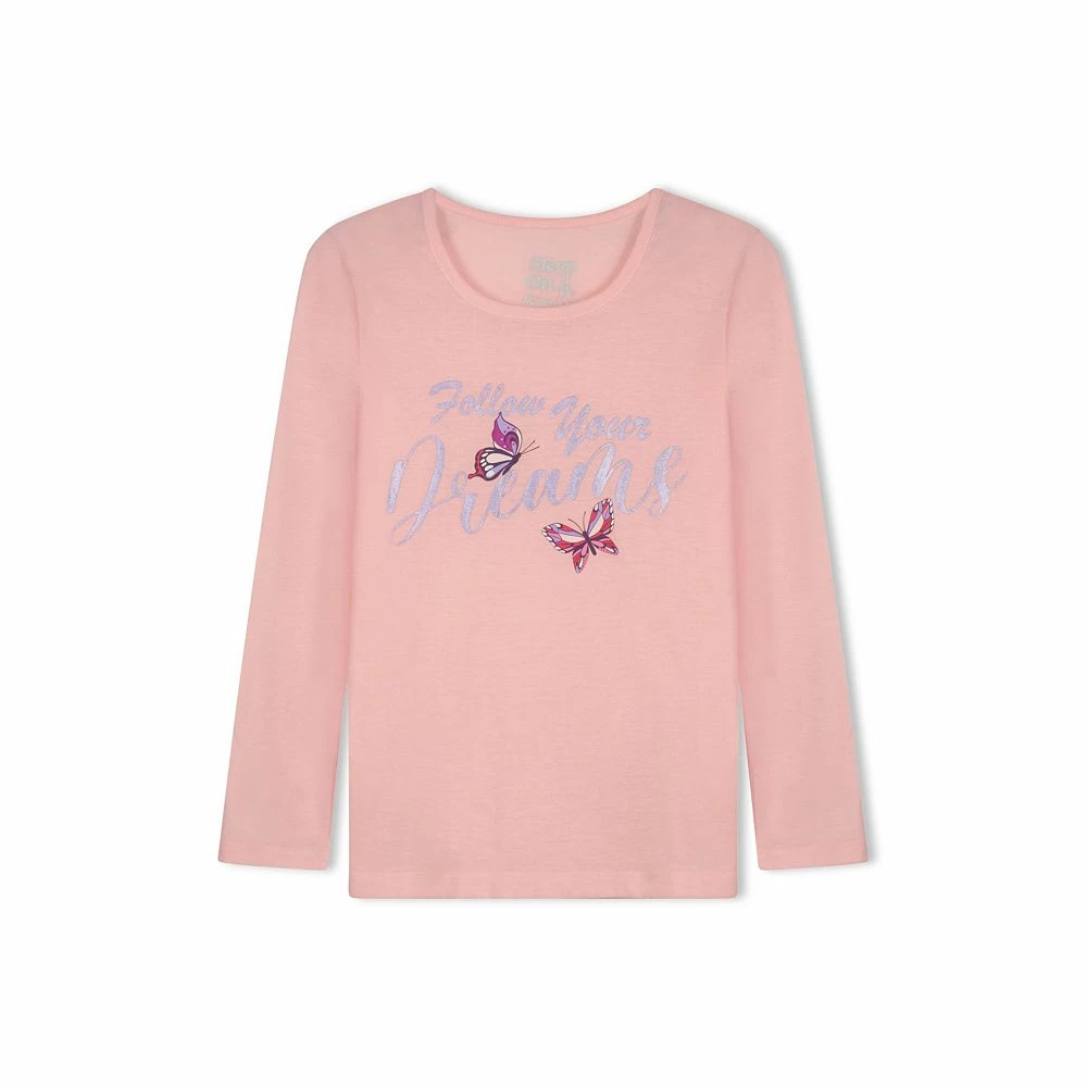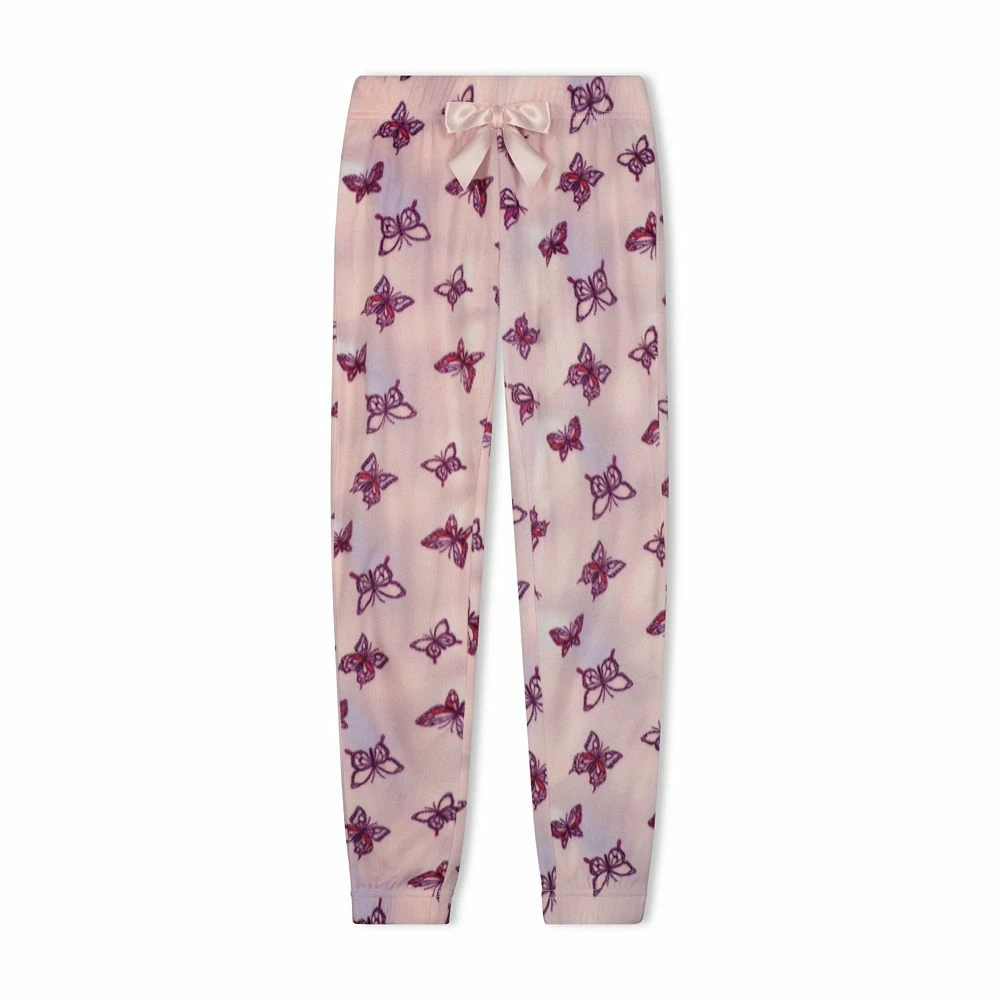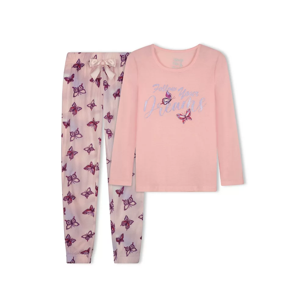 There’ll be nothing but sweet dreams ahead with this super-soft, two-piece pajama set. The long-sleeved t-shirt features a purple foil ‘follow your dreams’ quote on the pink brushed jersey. Keep her warm with the loose-fitting and snug-feeling Minky fabric pants in an ombre and all-over butterfly print. The elastic waist and cuffs provide extra comfort and she’ll love the delicate waist tie bow detail.