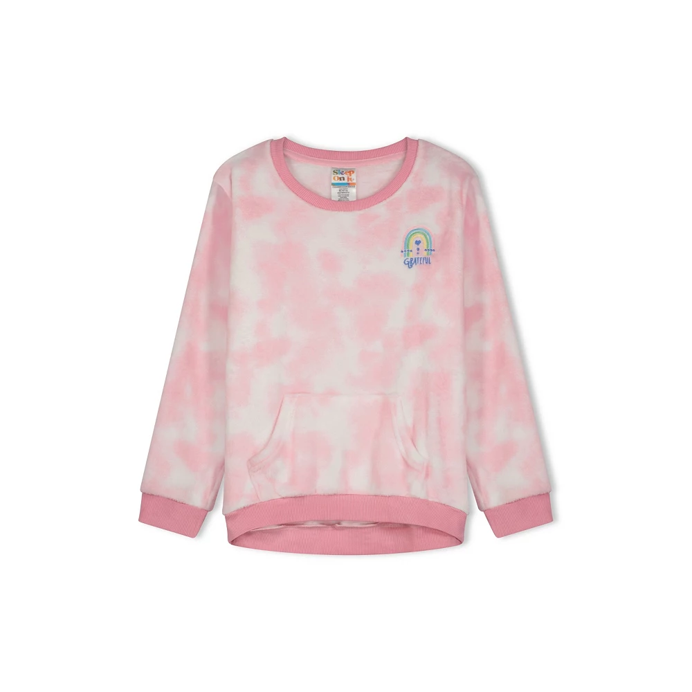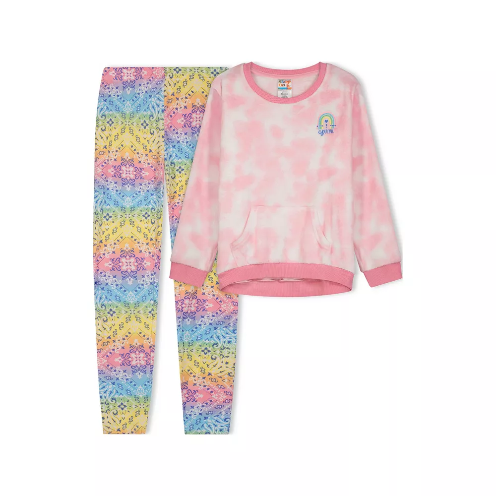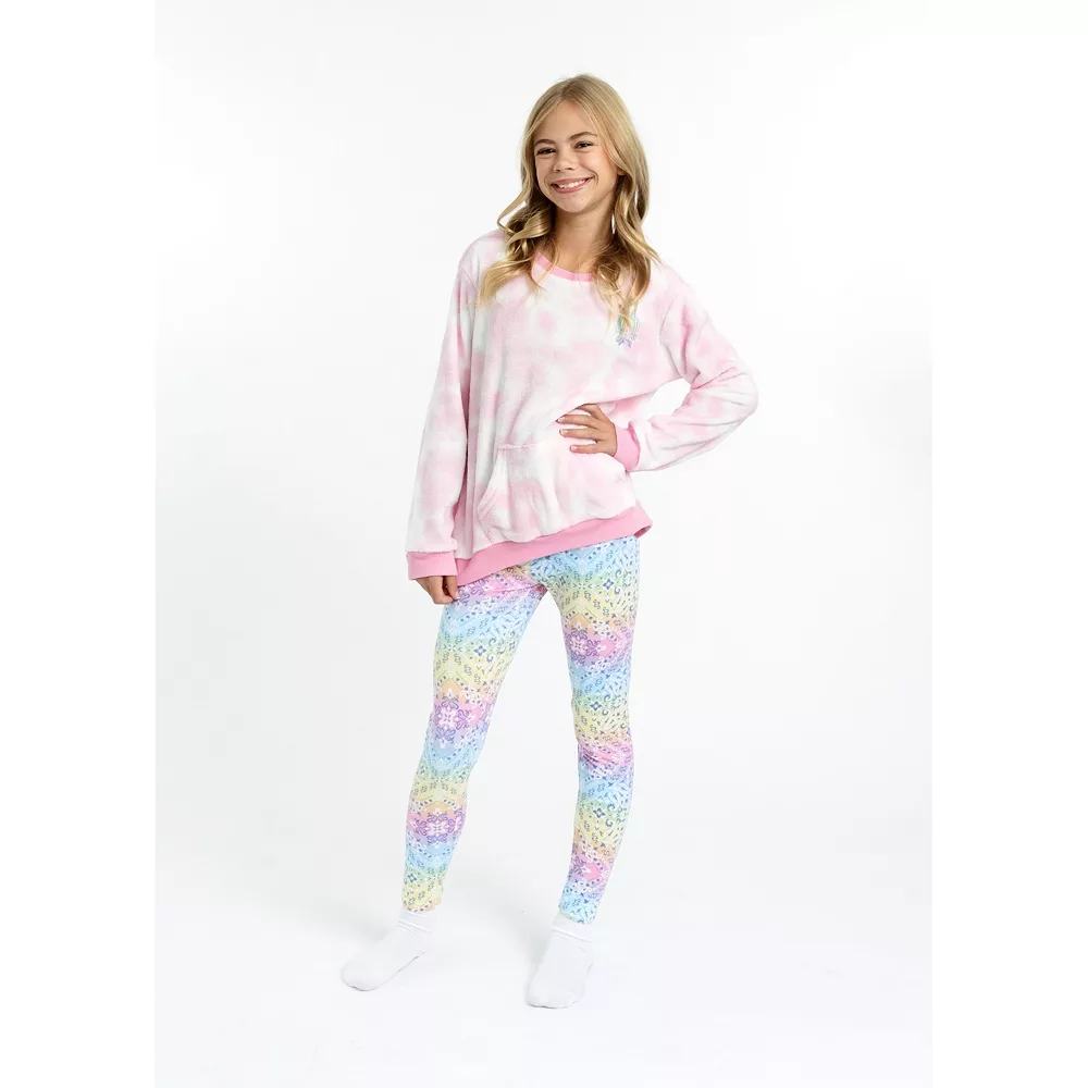 The perfect pajama set for lounging around the house. The long-sleeved sleep top has been cut to an oversized fit for extra comfort and comes in a snug pink fleece material and features an embroidered ‘grateful’ quote and rainbow design. This set comes with a pair of slim-fitting, super-soft spandex-jersey leggings in a bold ombre rainbow fabric with an ornate overlaid pattern. Perfect for chilled Sunday movie days.