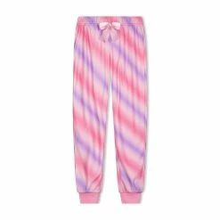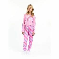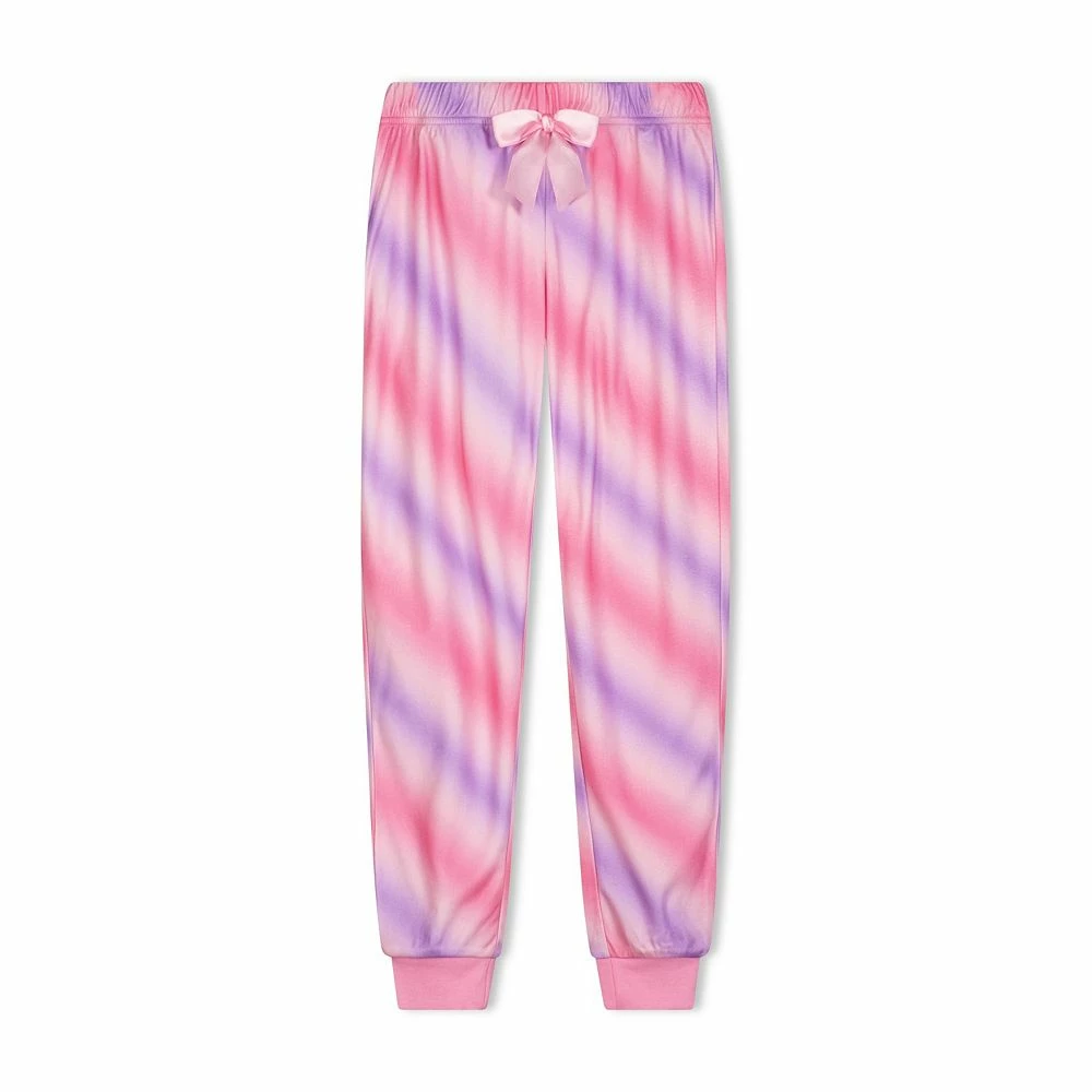 The perfect pajama set for fostering sweet dreams. This two-piece pajama set is made from a super-soft brushed jersey. The long-sleeved, crew neck t-shirt features a dreamy rainbow glitter screen print and line appliques on the sleeves. The matching pink ombre pants sport a super-cozy loose-fit and an elastic waist with delicate tie detailing for the ultimate nighttime comfort.