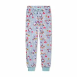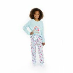 This is the perfect pajama set for your little sunshine. The loose-fitting cut provides perfect dream time comfort. The long-sleeved t-shirt, made from a buttery-soft jersey fabric, has a rainbow and uplifting quote print with glitzy gold glitter detailing. The Minky fabric pants, in an all-over unicorn rainbow print, will be super-cozy against her skin and features an elastic waistband for ultimate comfort and a sweet waist tie detail.