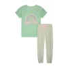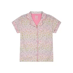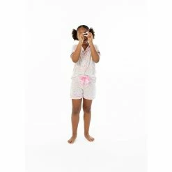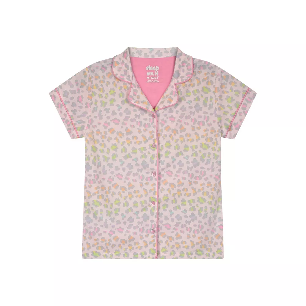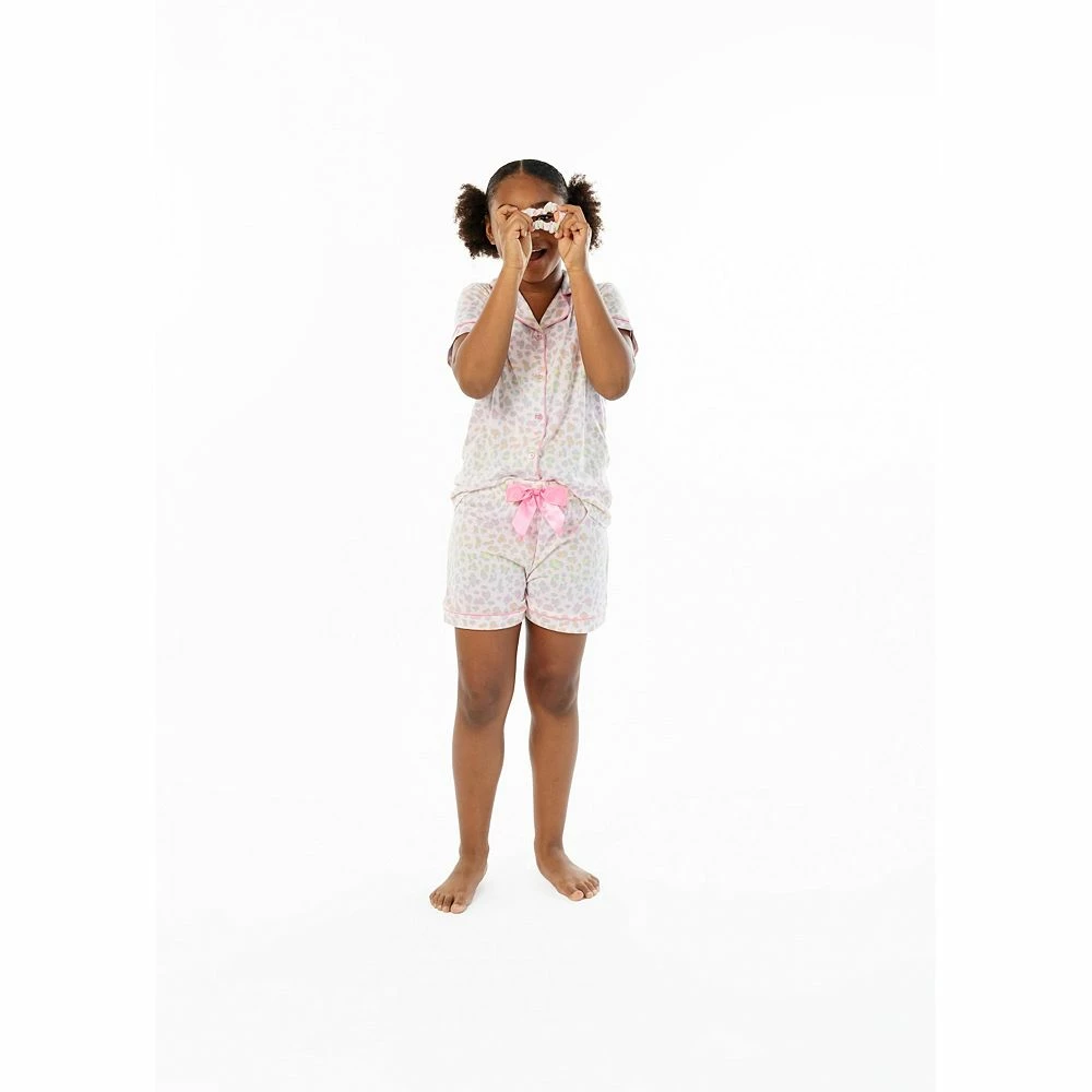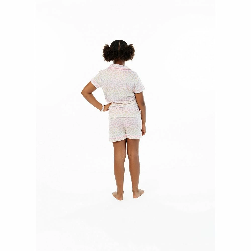 Rainbows or leopard print? With this super soft classic shirt style pajama set you can have both. With the glittered buttons, funky pastel rainbow leopard all-over print and airy shorts, she’ll look forward to bedtime. This set also features a matching pink ribbon bow detail, contrast piping details, and a matching hair scrunchie.