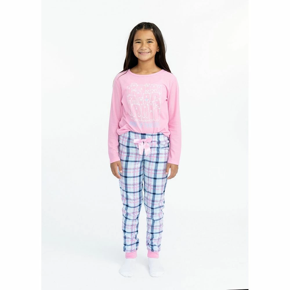 Give her a snug night’s sleep with this thermal jersey and Minky fleece pajama set. Cut to a loose fit, the long-sleeved t-shirt features a fun glitter bear print on the cozy pink fabric. To match, the super-soft pants have a contrasting blue plaid print. The elastic waist and ankle cuffs give the ultimate comfort experience and she’ll love the sweet waist tie detail.