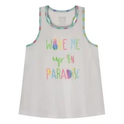 Who wants to wake up in paradise? With this super cool, extra soft jersey pajama set she’ll feel like she has. A racer-back style tank top and cozy loose-fitting shorts will keep her cool. Featuring a popping metallic rainbow slogan and funky rainbow pineapple print shorts with a sweet and stylish ruched detail.
